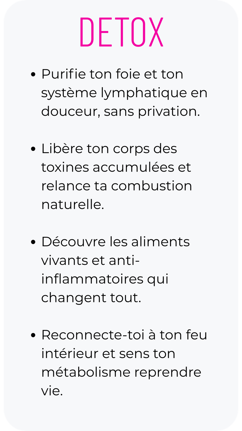 Tu découvres comment libérer ton corps de l’inflammation, relancer ta digestion et réactiver ton métabolisme en douceur.