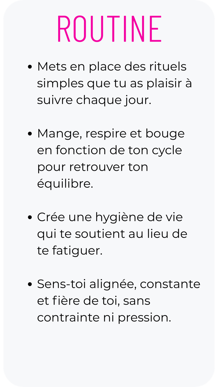 Des exercices de respiration, renforcement et des rituels d’ancrage et des astuces hormonales pour reconnecter ton énergie à ton cycle.